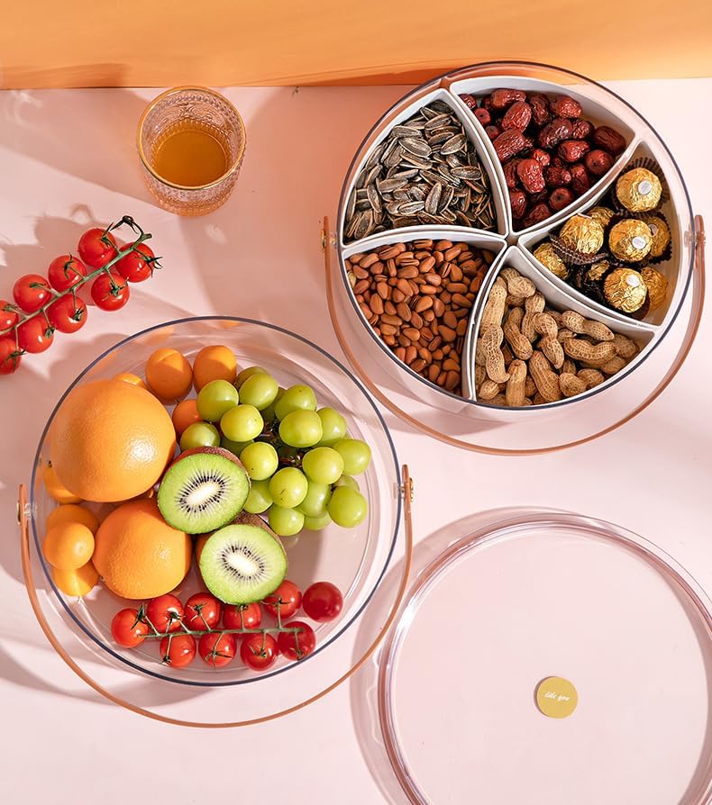 Multiple compartments: The container has multiple sections for organizing different types of snacks, such as nuts, candies, dried fruits, and more. 1 1.