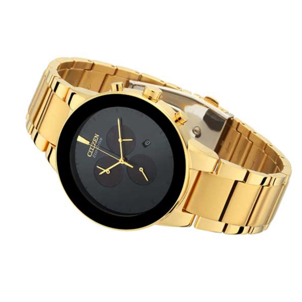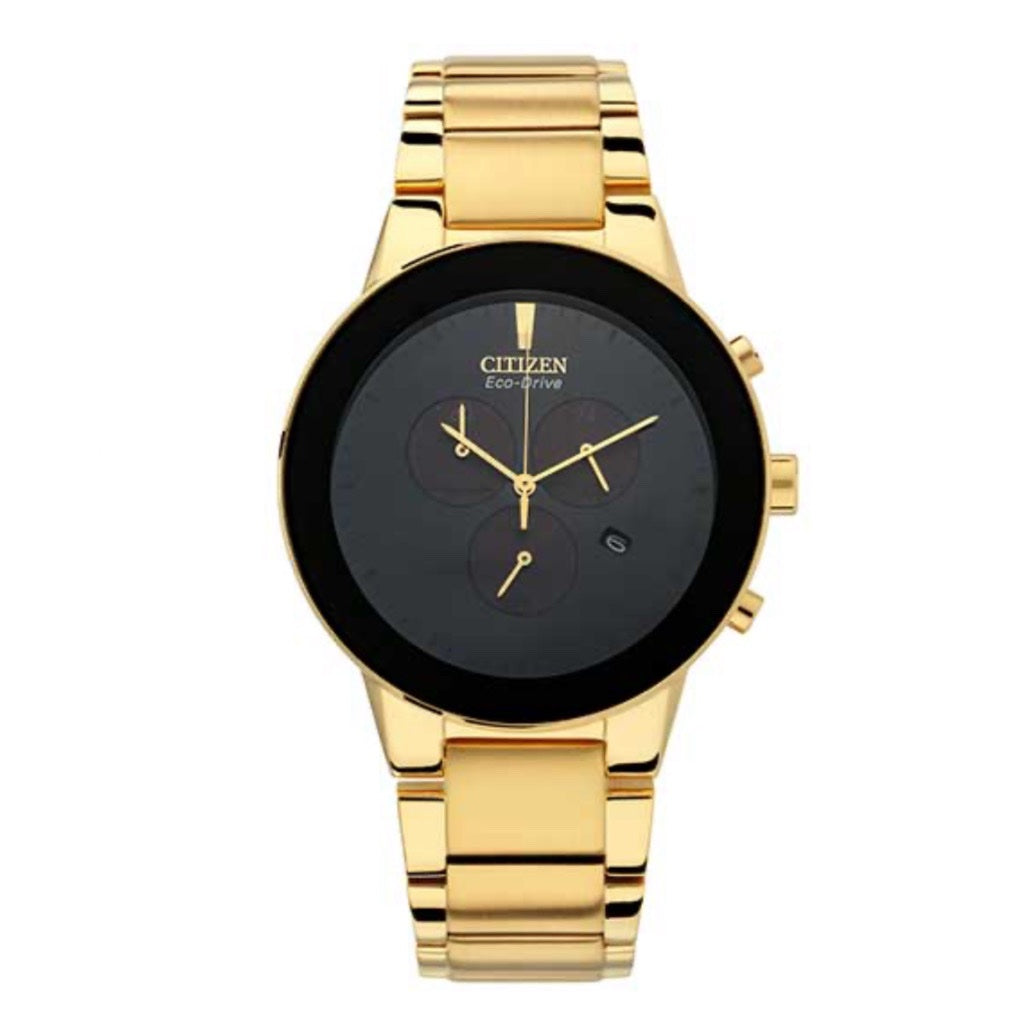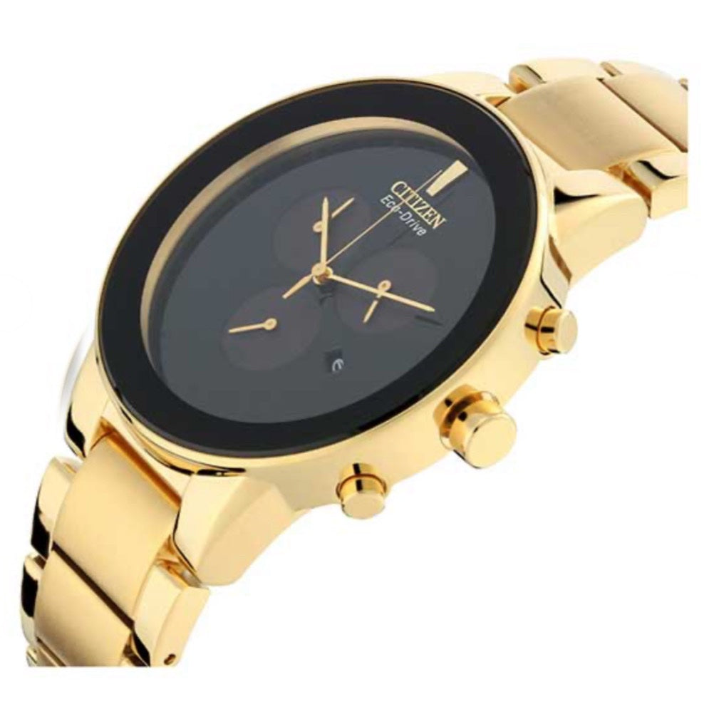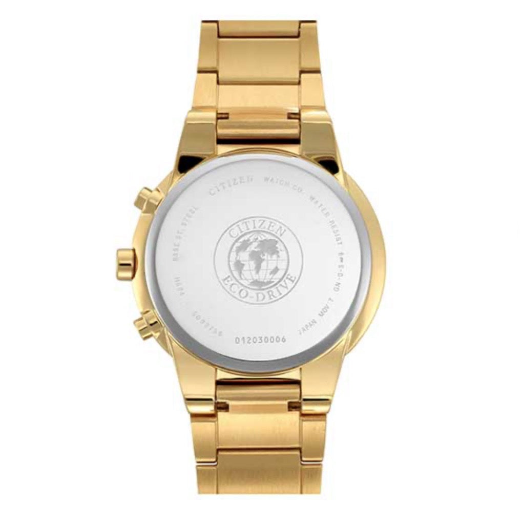 With its refined gold finish and eco-driven movement, this chronograph watch is the ideal accessory for those who value both sustainability and timeless elegance.