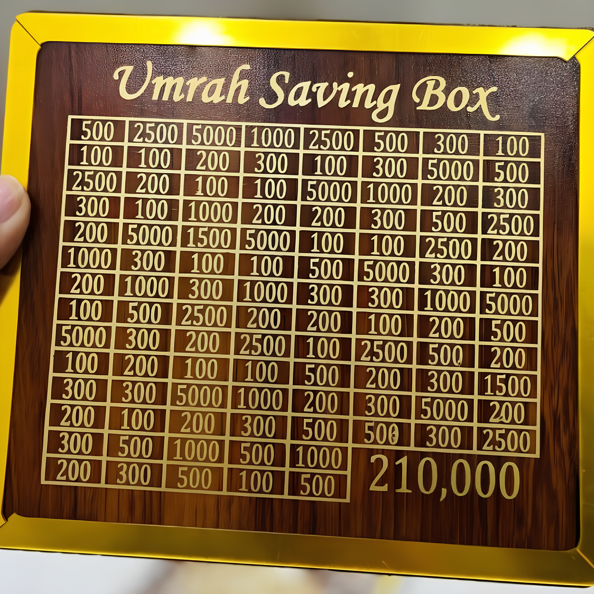 Save with purpose and faith! This beautifully crafted wooden Umrah Savings Box, featuring an acrylic lid, is designed to help you collect your savings for the sacred journey.